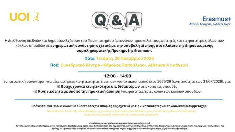 Important Σημαντική ανακοίνωση για φοιτητές/τριες – Συμπληρωματικές Προκηρύξεις Erasmus+ για (i) Βραχυχρόνια περίοδο Σπουδών Υπ. Διδακτόρων και/ή (ii) Πρακτική Άσκηση (όλων των κύκλων σπουδών)_Σχέδιο 2024) More 14 November 2025 12:10