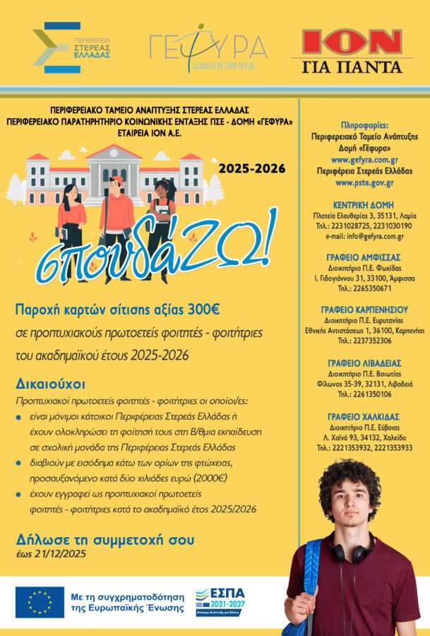 ΦΟΙΤΗΤΙΚΟ ΕΠΙΔΟΜΑ 300€ ΓΙΑ 6η χρονιά ΜΕΣΩ ΤΗΣ ΔΡΑΣΗΣ «σπουδά…ΖΩ!»2025-2026 ΤΗΣ ΠΕΡΙΦΕΡΕΙΑΣ ΣΤΕΡΕΑΣ ΕΛΛΑΔΑΣ, ΜΕ ΧΟΡΗΓΙΑ ΤΗΣ ΙΟΝ Α.Ε. ΒΙΟΜΗΧΑΝΙΑΣ & ΕΜΠΟΡΙΟΥ ΚΑΚΑΟ ΚΑΙ ΣΟΚΟΛΑΤΑΣ – ΠΛΗΡΟΦΟΡΙΑΚΟ ΥΛΙΚΟ